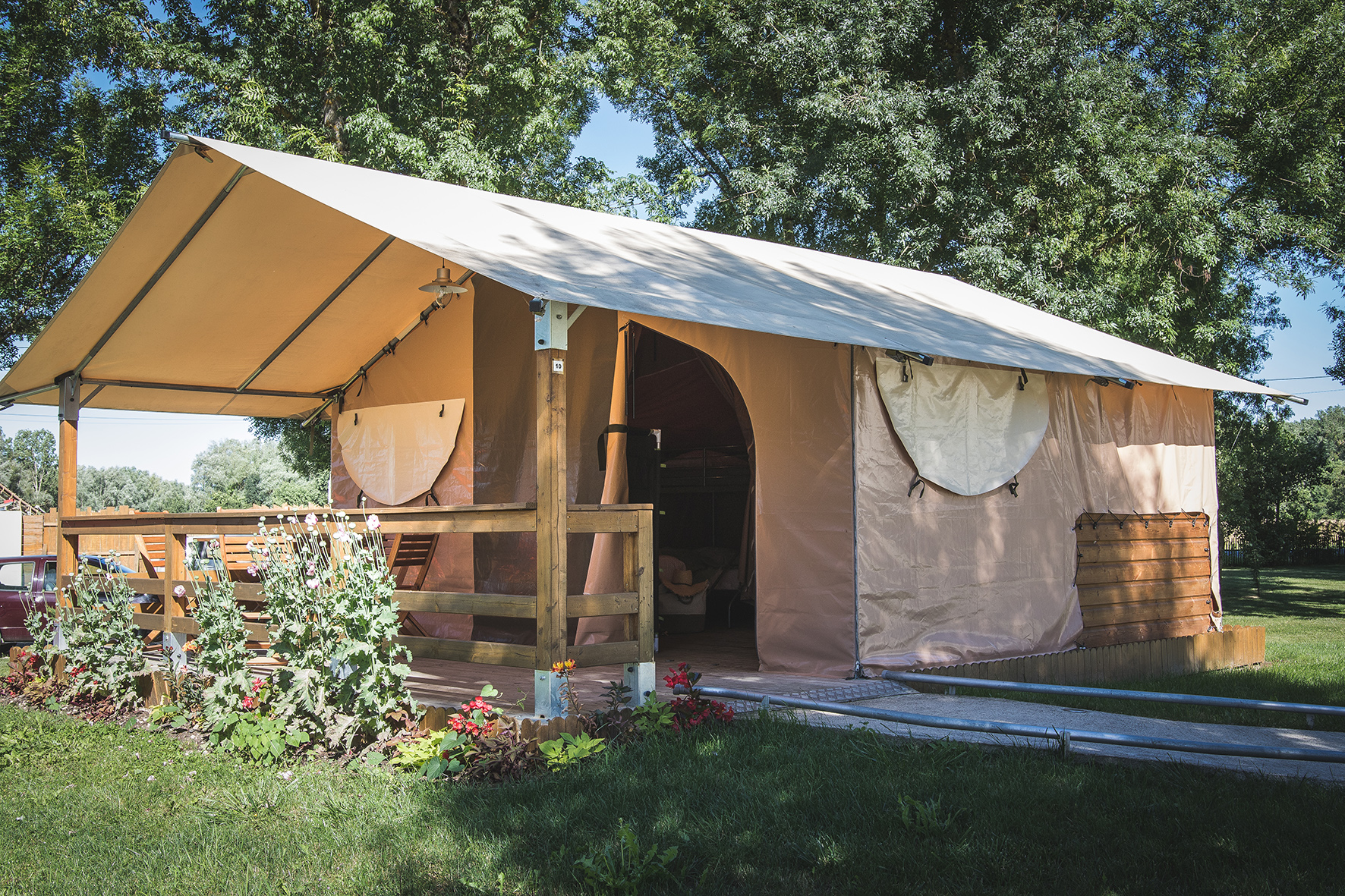Le lodge toilé se trouve à proximité immédiate de la réception, des parkings et de la yourte des petits déjeuners. Sa grande terrasse couverte, équipée d’un salon de jardin, fait face à l’aire de jeux pour les enfants.