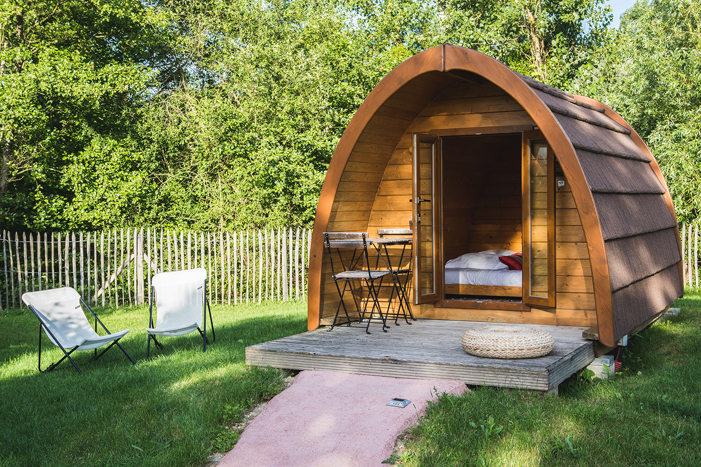 En fusion avec la nature, la cabane Pod offre une surface utile de près de 6 m², avec éclairage et chauffage, et une porte fenêtre à double vitrage qui s’ouvre sur une terrasse. Avec le Pod, l’esprit camping est préservé mais sans ses inconvénients…